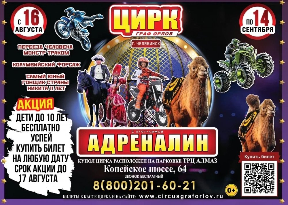 Челябинск, встречайте! С 16 августа по 14 сентября 2025 года гастроли Цирка «Граф Орлов» с невероятным шоу «Адреналин»! Купол цирка расположен около ТРЦ «Алмаз»!
