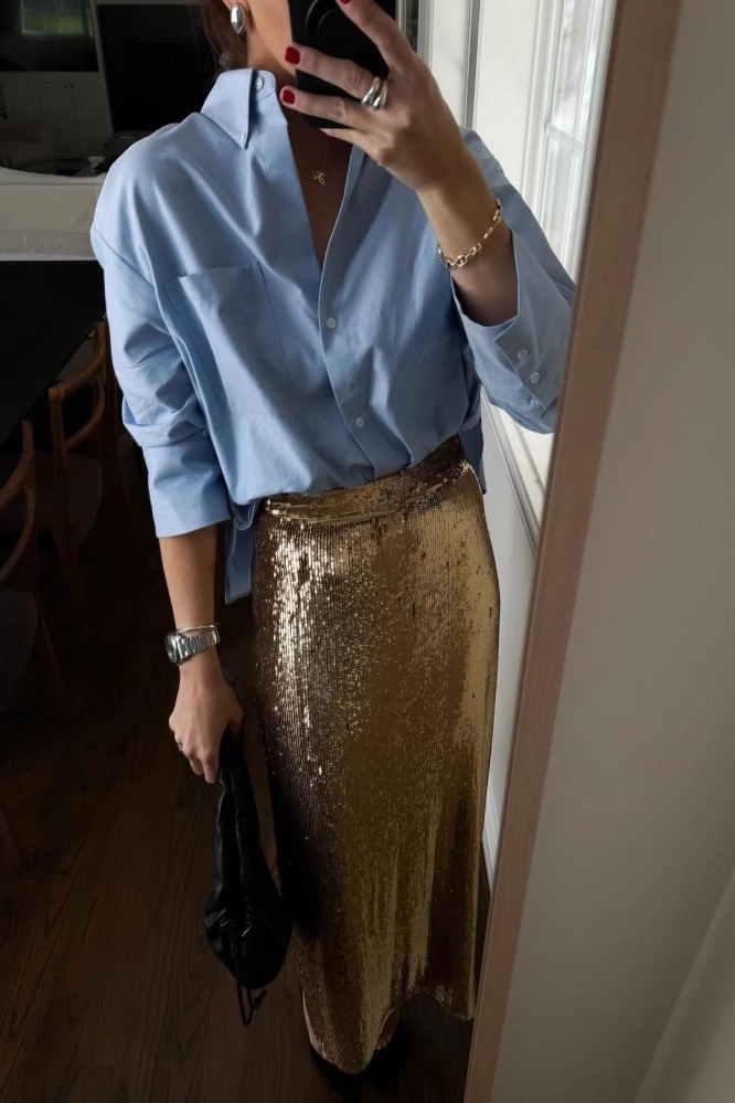 Тёплый медный и бронзовый металлик привносят ноту процветания. Эти оттенки не просто блестят, а обладают глубиной и характером. Их лучше использовать точечно: в виде акцентных украшений, в деталях клатча или в отделке одежды — металлизированной нити в ткани или эффектных пуговицах.