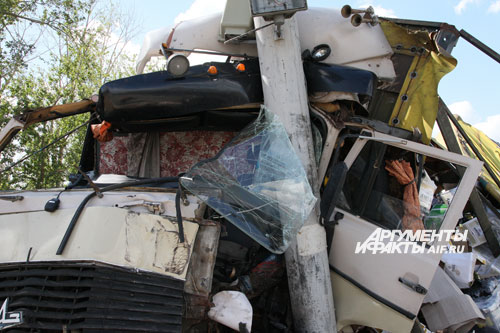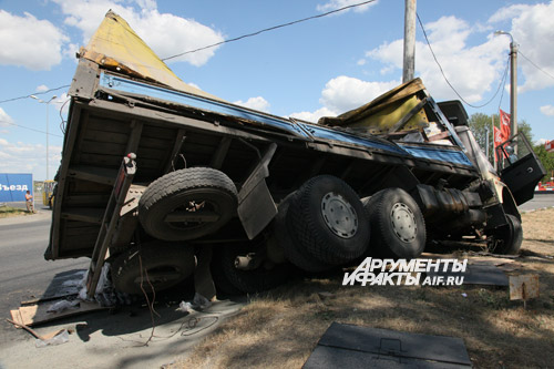 Большегруз, гружённый пивом, врезался в бетонный столб у въезда на заправочную станцию. Автомобиль перекосило, а кабину от удара практически полностью разнесло.