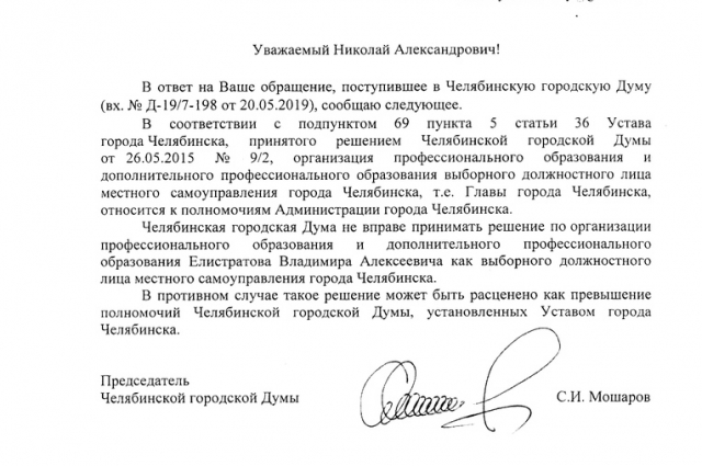 «Организация профессионального образования и дополнительного профессионального образования выборного должностного лица местного самоуправления Челябинска относится к полномочиям Администрации города. Челябинская городская Дума не вправе принимать решение по организации образования Елистратова Владимира Алексеевича, так как такое решение может быть расценено как превышение полномочий Гордумы», - говорится в тексте ответа, подписанного Мошаровым.