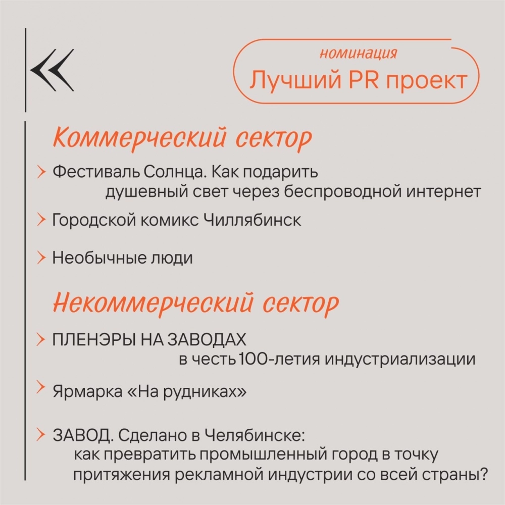 «5 и 6 февраля нас ждёт увлекательное путешествие в мир PR, — сообщает председатель Клуба пресс-служб Челябинской области, руководитель АНО „МасШтаб“ Елена Давлетшина. — 19 проектов, среди которых есть, например, Фестиваль Солнца и ярмарка „На рудниках“, корпоративный подкаст IScast и городской комикс Чиллябинск, частный канал в телеграм КУЛЬТ_про_СВЕТ и канал кошки Маси ВКонтакте, Волонтёрское движение и Необычные люди.