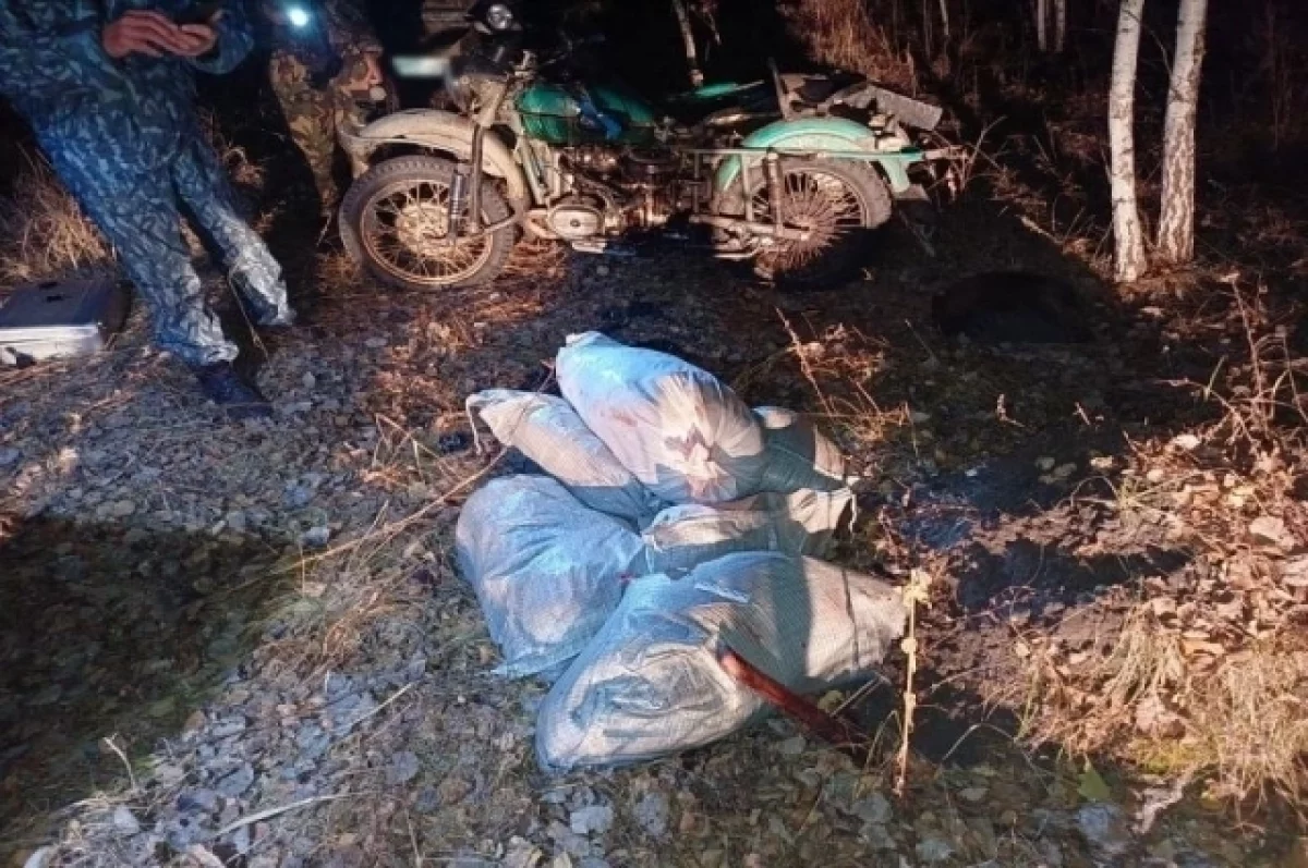 Заметив охотоведов, пассажиры попытались скрыться. Пассажир спрыгнул с мотоцикла и бросился в лес, а водитель продолжил движение. Однако оба нарушителя были задержаны. При осмотре у них обнаружили семь мешков с мясом диких животных.