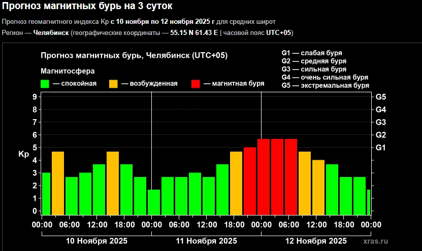 «Вечером вторника прогнозируются магнитные бури интенсивностью от слабого до среднего уровня, G1-G2, которые продлятся до утренних часов среды, а «успокоится» земная магнитосфера лишь во второй половине 12 ноября», — пишет синоптик в своём телеграм-канале.