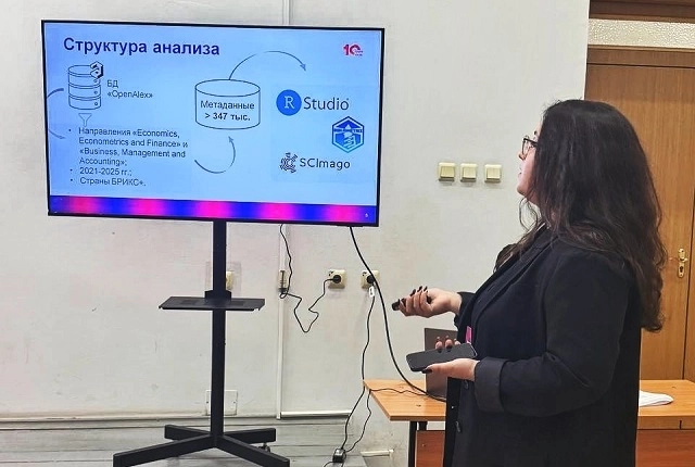 В финале выступили представители всех регионов России и более 20 иностранных государств. Среди них — и аспирантка второго курса направления «Региональная и отраслевая экономика», ведущий специалист отдела наукометрии УрГЭУ Елизавета Соколова. Она представила доклад о том, как сегодня научное сообщество преуспевает в публикации своих исследований, а также оценила перспективы развития научного сотрудничества в странах БРИКС+ в направлениях экономики и управления.