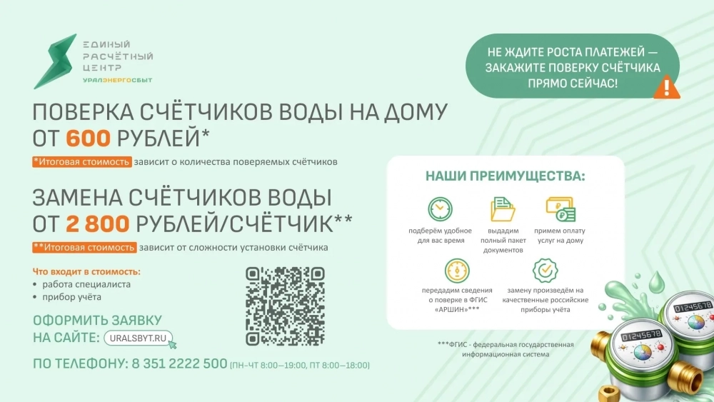 По итогам марта 2026 года ЕРЦ «Уралэнергосбыт» расширяет географию по приёму заявок на поверку приборов учёта воды. В городах Троицк и Миасс Челябинской области начинается приём заявок на поверку и замену индивидуальных приборов учёта холодного и горячего водоснабжения.