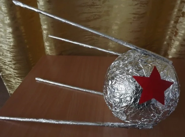 Сперва нужно сделать корпус — смять газету, придать ей форму шара и обернуть фольгой. К корпусу приклеивают 4 длинные палочки — это будут антенны, их следует покрасить серебристой краской. На сам шар можно наклеить красную пятиконечную звезду — как на советских плакатах. Поделку закрепляют на подставке из картона или пластилина.