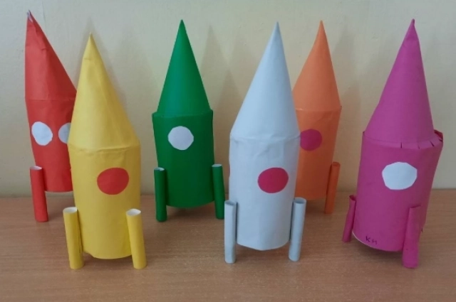 Ракета из втулки от туалетной бумаги — самый простой вариант. Её обклеивают бумагой, сверху прикрепляют конус и украшают иллюминатором.