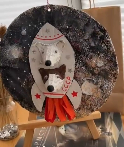 Материал изготовления — картон. На картонную основу наклеивается основание ракеты. Мордочки собак можно сделать из ячеек яичной грохотки.