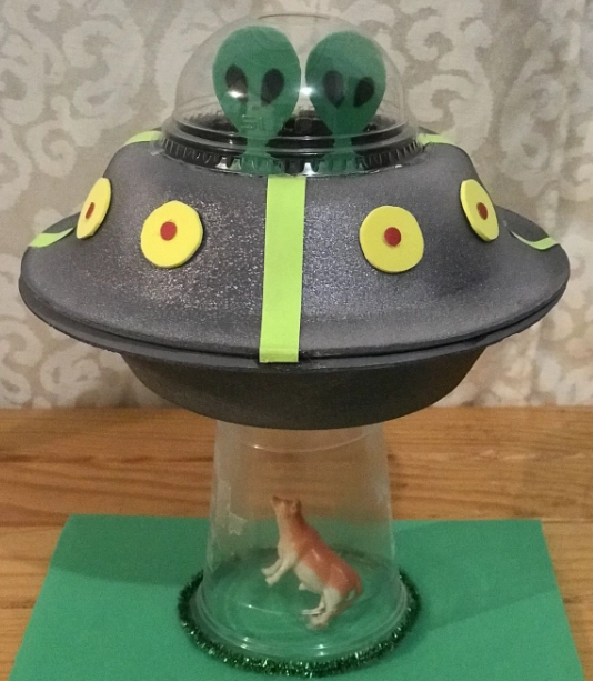 Сделать такой космический корабль очень просто — достаточно взять одноразовую тарелку. Точнее, две. Склеить их вместе , вырезать донышко у верхней половины поделки и поместить внутрь фигурку пришельца. А сверху накрыть пластиковым стаканом.