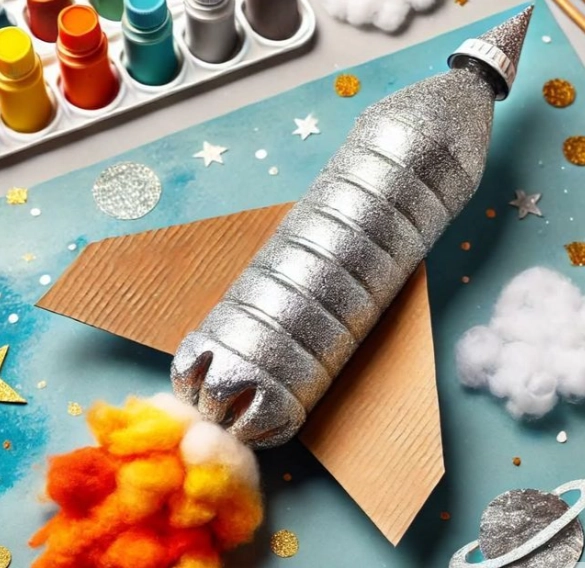 Более интересный вариант — взять пластиковую бутылку, покрасить её серебристой краской, сбоку прикрепить картонные сопла, а огненный хвост смастерить из ваты, выкрашенной в красный и оранжевый цвета.