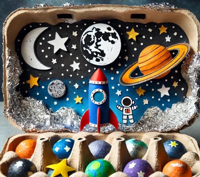 Лёгкий и доступный вариант — сделать диораму с Солнцем и планетами из яичной грохотки. Для этого её нужно раскрасить под цвет ночного неба, установить ракету из втулки или космонавта из фольги.