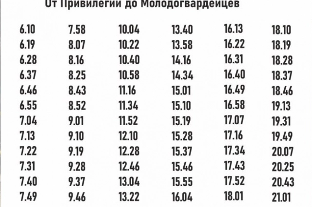 Маршрут начинает работу в 6.10. А последний рейс отъезжает от «Привилегии» в 21.10, от Молодогвардейцев – в 22.13. Интервал движения составляет девяти до 36 минут.