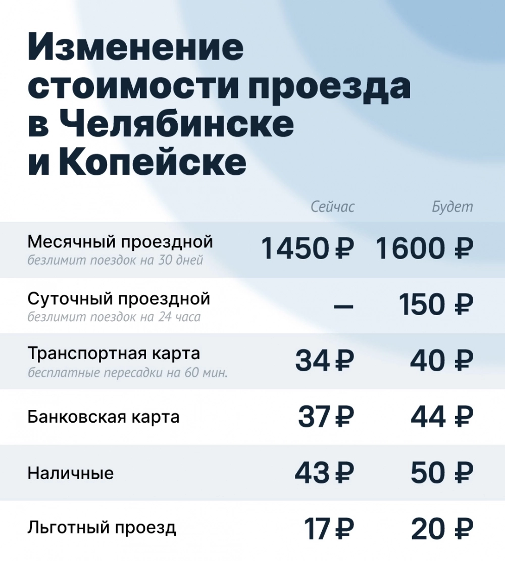 Кроме того, как пояснили транспортники, месячный безлимит теперь рассчитывается из 40 поездок, что ближе к реальному использованию большинством горожан и делает проездной более достижимым по цене. Во вторых, в Челябинске и Копейске появится суточный безлимитный проездной за 150 рублей. Это станет хорошим решением для гостей города и эпизодических поездок, так как такой проездной получается выгоднее четырёх поездок по транспортной или банковской карте.