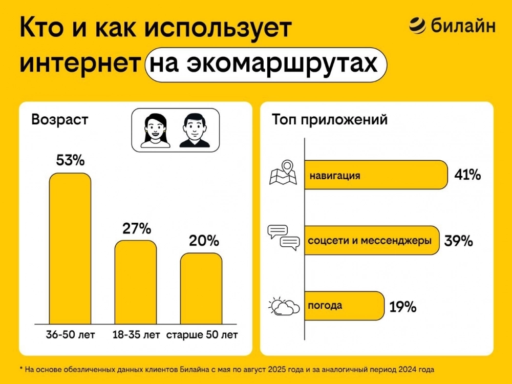 По данным Билайна, чаще всего экомаршрутами интересовались клиенты в возрасте от 36 до 50 лет (53%). Молодежь от 18 до 35 лет заняла второе место в туристическом трафике (27%). А вот старшее поколение от 50 лет оказалось только на третьем месте (20%).