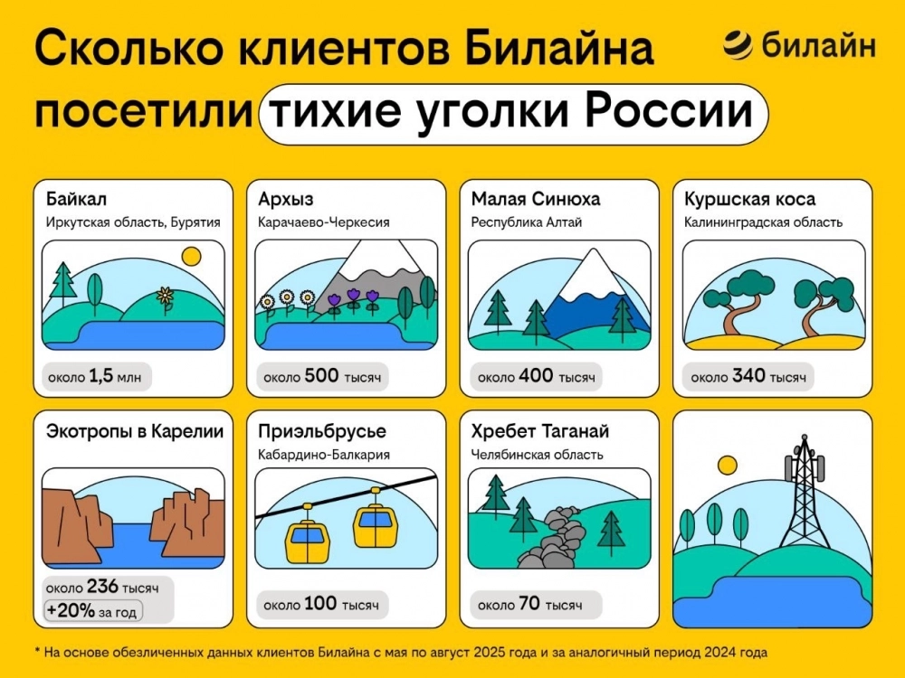 Интерес россиян к внутреннему туризму растет. Количество пользователей на некоторых направлениях выросло на 20%, подсчитал Билайн. Вот необычные точки России, в которых летом сетью Билайна воспользовались миллионы пользователей.