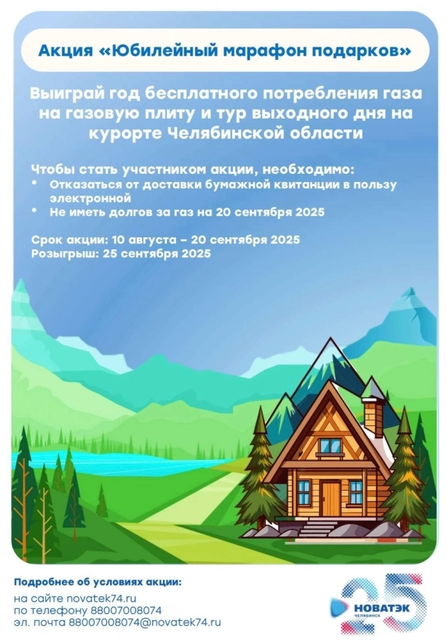 В честь 25-летия компании «НОВАТЭК-Челябинск» 10 августа стартует новая акция — «Юбилейный марафон подарков»! Впервые, главный приз — тур выходного дня на курорте Челябинской области.