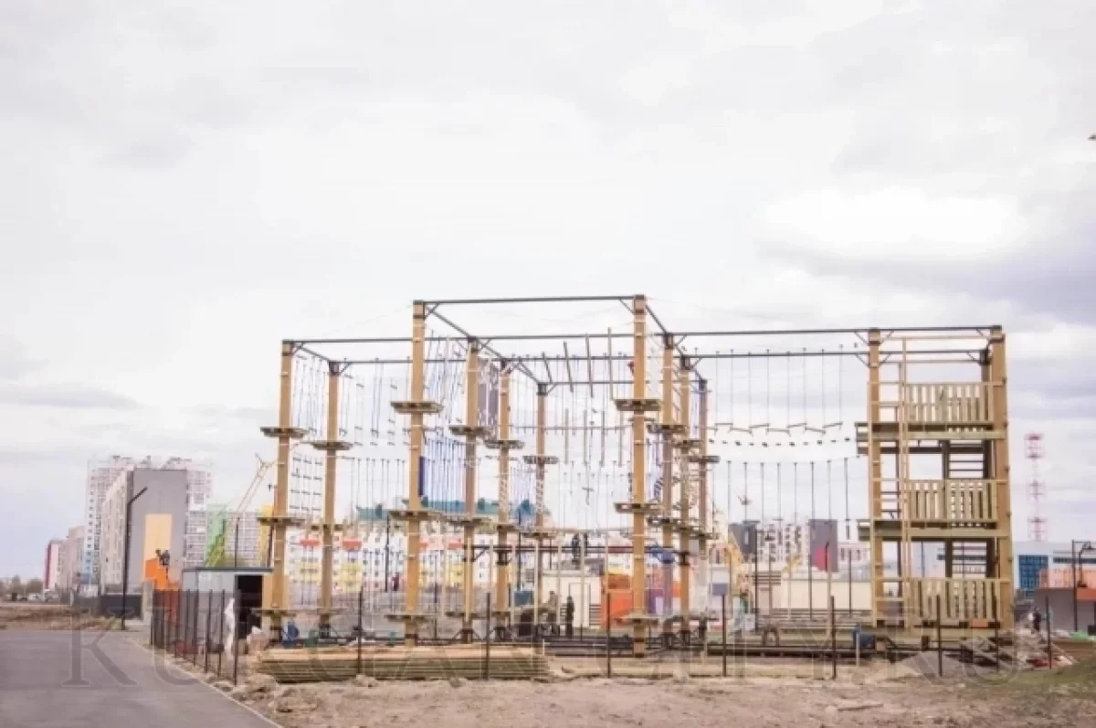 Сейчас на территории идёт монтаж трёхуровневой конструкции. Скоро жители смогут испытать силу и ловкость на трассах разной сложности. Проект рассчитан на посетителей всех возрастов.