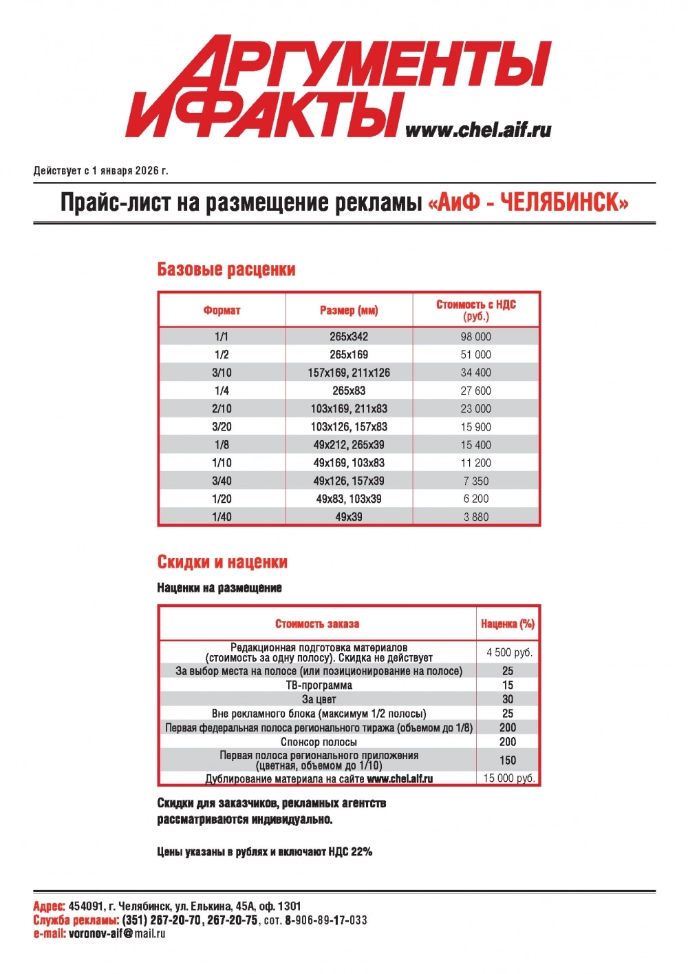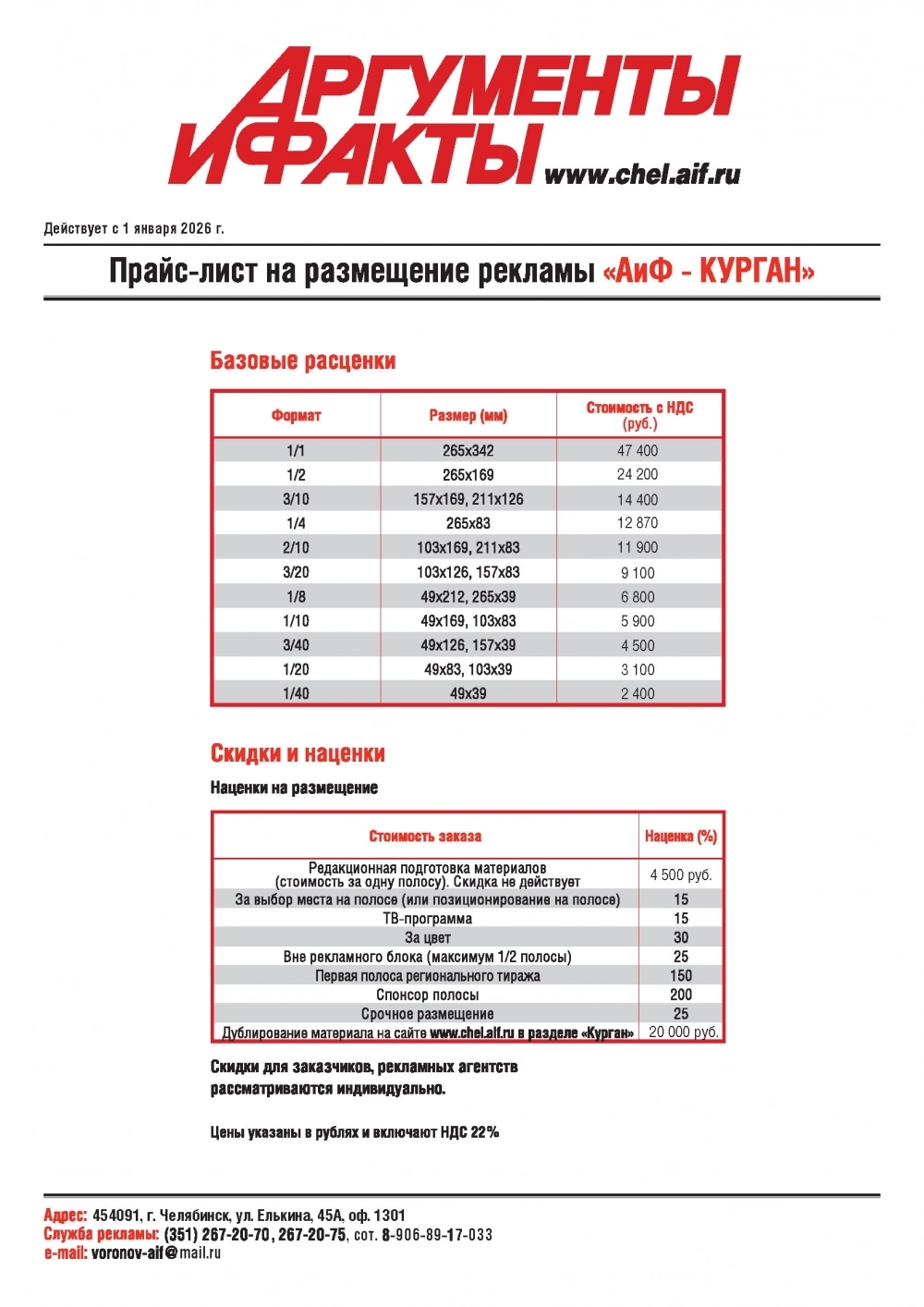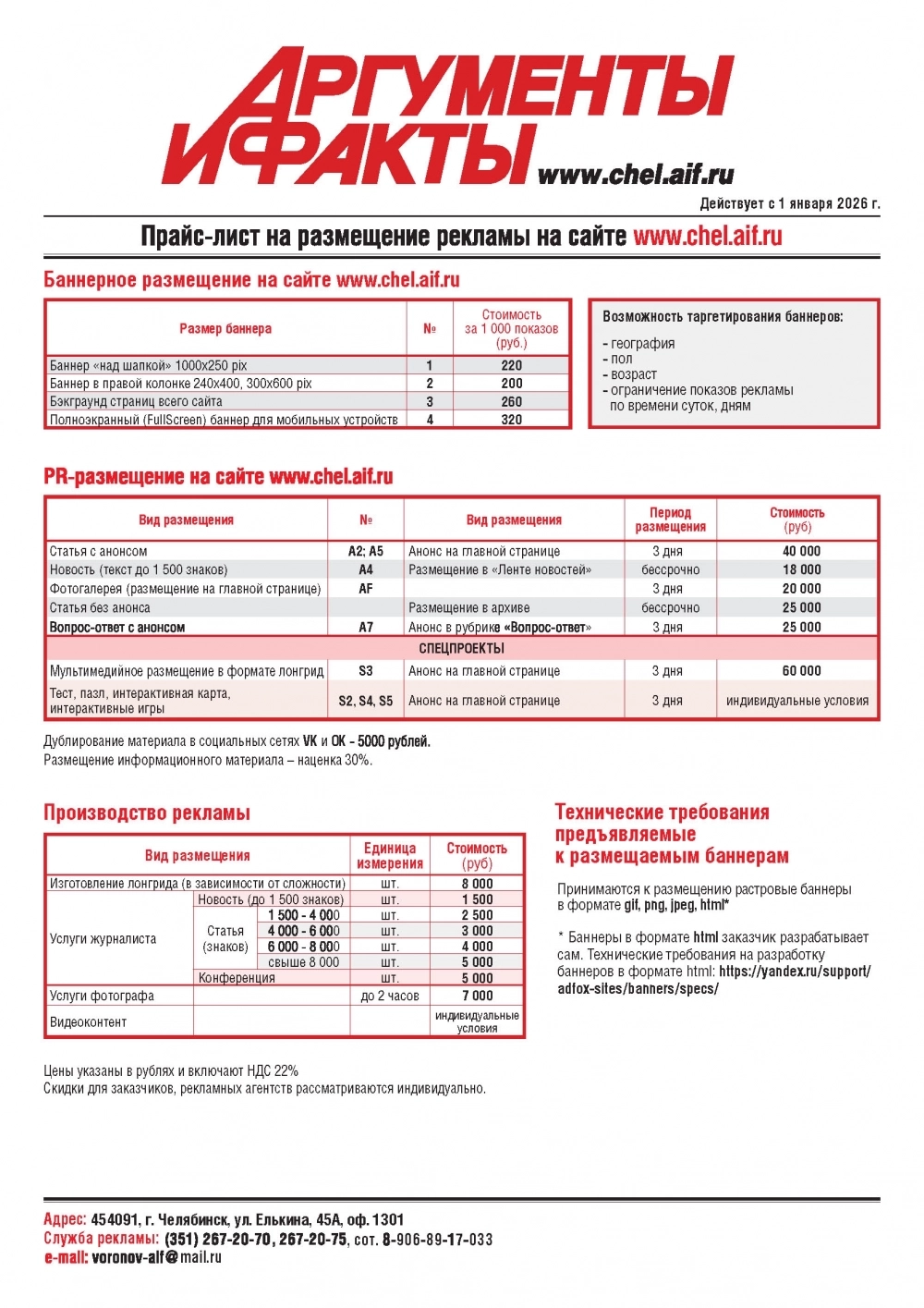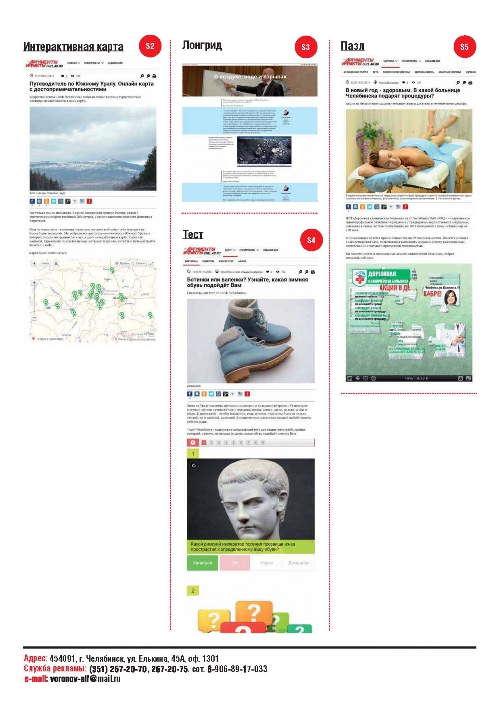 Размещение в еженедельнике «Аргументы и Факты — Челябинск» Размещение на сайте chel.aif.ru Размещение в еженедельнике «Аргументы и Факты — Курган»